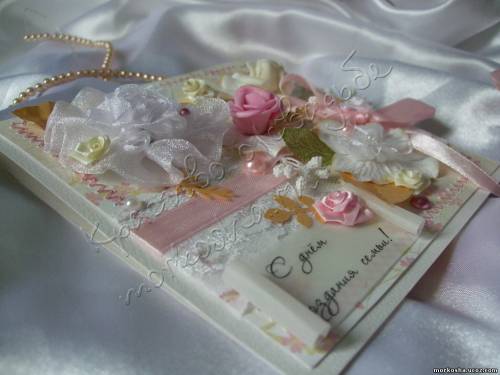 | Дизайнерская бумага, фон, бумажные цветы и лепестки, фигурный дырокол, половины чешских бусин, атласные и капроновые цветы, атласные ленты, калька, машинная строчка, кружево |